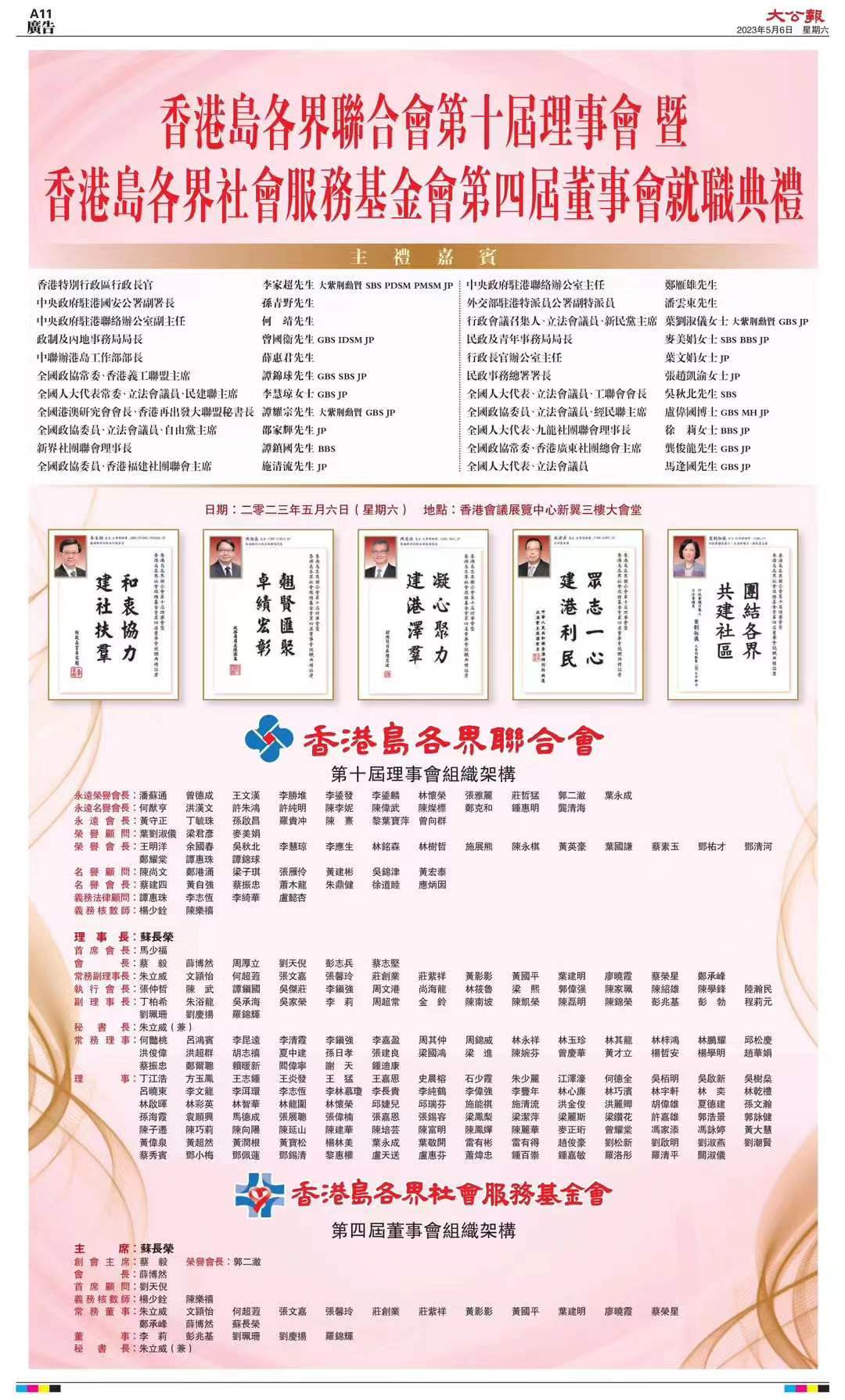5月6日,香港島各界聯(lián)合會(huì)第十屆理事會(huì)暨香港島各界社會(huì)服務(wù)基金會(huì)第四屆董事會(huì)就職典禮在香港會(huì)議展覽中心舉行。香港特別行政區(qū)行政長(zhǎng)官李家超,中央人民政府駐香港特別行政區(qū)聯(lián)絡(luò)辦公室主任鄭雁雄、副主任何靖,中華人民共和國(guó)外交部駐香港特別行政區(qū)特派員公署副特派員潘云東,中央人民政府駐香港特別行政區(qū)維護(hù)國(guó)家安全公署副署長(zhǎng)孫青野,香港特區(qū)行政會(huì)議非官守議員召集人葉劉淑儀等逾1500名社會(huì)各界人士出席典禮。