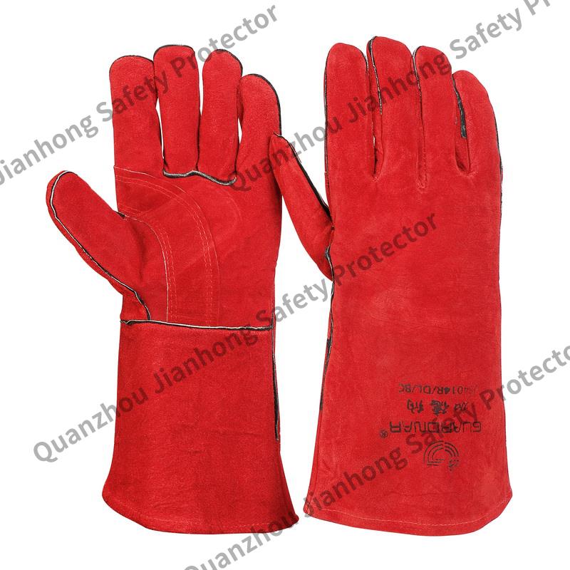 Thermal insulation welder protective gloves, gardenia shaped thumb, cow leather to strengthen the palm surface, lengthen the cuff length by 14cm, which can effectively protect against mechanical risks, fire and fire, heat conduction and contact heat, and prevent droplets from melting and metal sputtering.